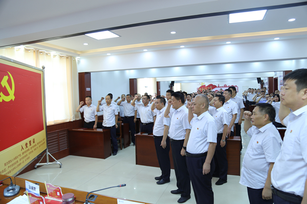 接著,在王高峰同志帶領(lǐng)下,面向鮮紅的中國(guó)共產(chǎn)黨黨旗,18名新黨員舉起右拳、莊嚴(yán)宣誓,許下錚錚誓言。全體老黨員一同重溫入黨誓詞,齊憶初心使命。