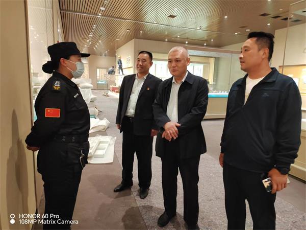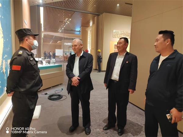 在殷墟博物館,魏東拜訪了殷墟博物館黨總支書記、常務(wù)副館長趙清榮和副館長徐河建,深入了解館方需求以及安保工作中的不足之處。趙清榮對特保大隊殷墟中隊認真負責(zé)的工作態(tài)度給予了充分肯定。魏東表示,公司將按照博物館領(lǐng)導(dǎo)要求和合同約定,全力以赴做好新展館開館前的各項安保工作。隨后,魏東來到殷墟新展館,認真查看駐點勤務(wù)情況,詳細了解特保隊員的工作環(huán)境和思想動態(tài)。魏東強調(diào),目前新展館處于施工沖刺和前期布展的關(guān)鍵階段,特保隊員一定要克服困難,履職盡責(zé),為新展館順利開館提供安全保障。