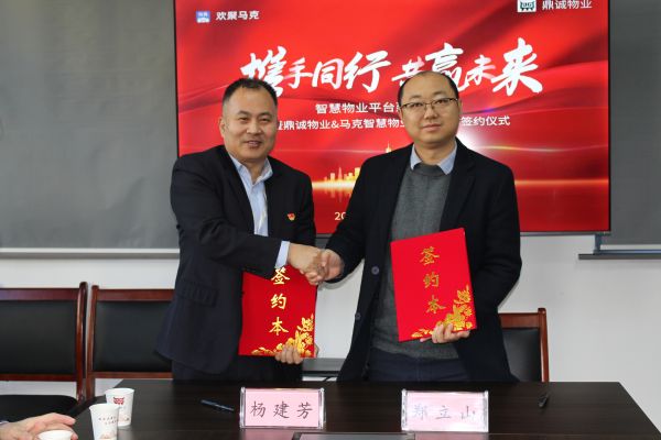 隨后,歡聚馬克創(chuàng)始人鄭立山與鼎誠物業(yè)經(jīng)理楊建芳進行戰(zhàn)略合作簽約。