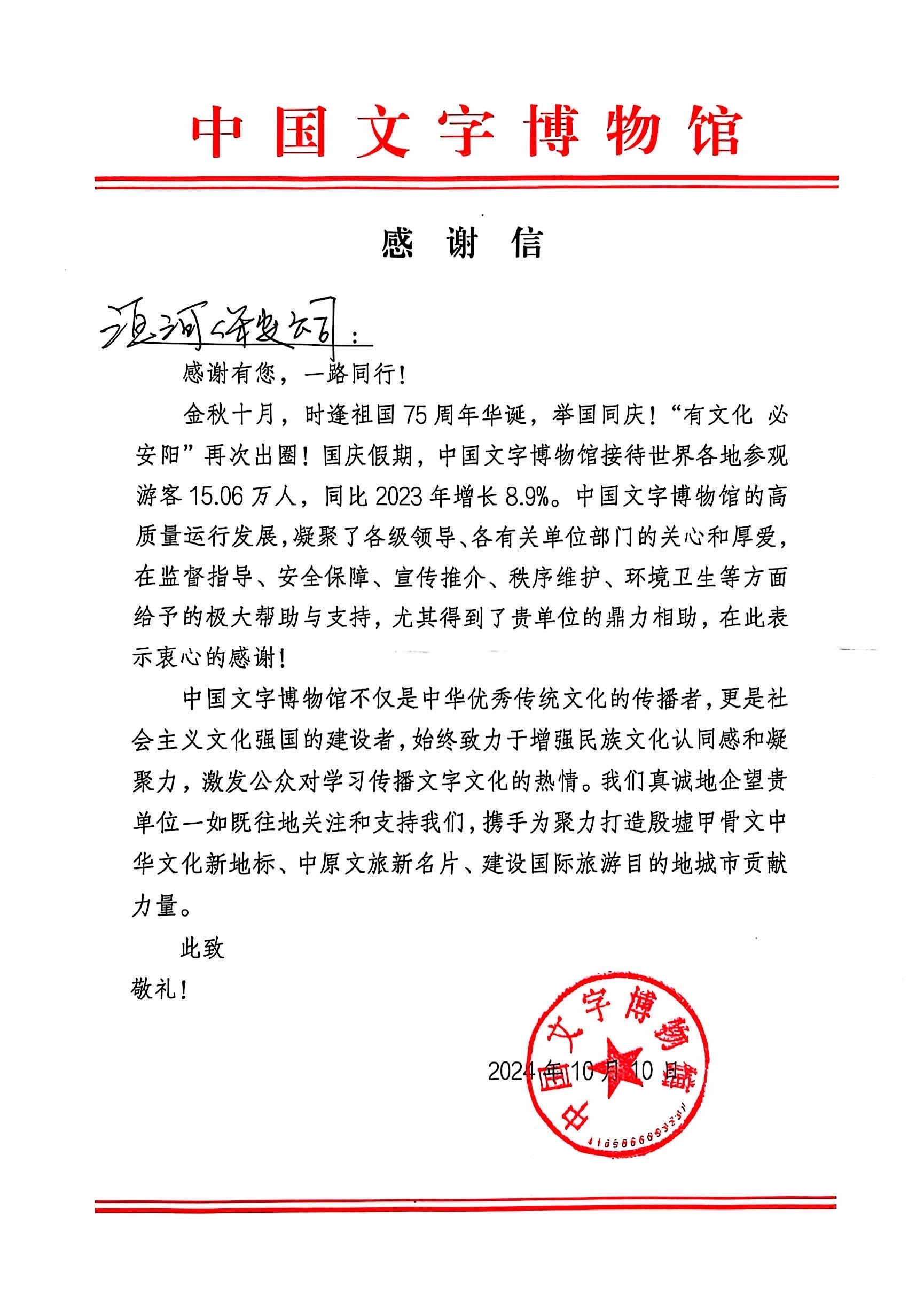10月12日,中國文字博物館安全保衛(wèi)部主任孫琳杰專程來到我公司,送來一封感謝信,以此感謝今年國慶期間公司在安全保衛(wèi)工作中所付出的努力和作出的貢獻(xiàn)。此次國慶期間,中國文字博物館接待世界各地參觀游客15.06萬人次,參觀人數(shù)多、時間長、影響面廣,公司全體保安員盡職盡責(zé),嚴(yán)格落實(shí)各項(xiàng)安保措施,以飽滿的熱情和敬業(yè)的工作態(tài)度,為博物館安全作出了積極貢獻(xiàn)。
