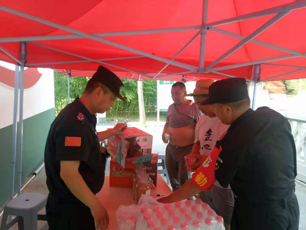 由于高溫干旱,防火成為糧庫(kù)的首要工作。保安員犧牲休息時(shí)間配合中儲(chǔ)糧,聯(lián)合公安、消防等部門開展消防安全大檢查并開展消防安全演練,增強(qiáng)了消防安全意識(shí),提升了消防滅火能力。為確保出入糧庫(kù)車輛有序、安全,隊(duì)員每天早來(lái)晚歸,維護(hù)糧庫(kù)大門口秩序。看到糧農(nóng)排隊(duì)售糧,保安班長(zhǎng)馮秋森安排隊(duì)員架設(shè)愛(ài)心涼亭,擺放愛(ài)心座椅, 備足熱水、礦泉水等防暑降溫用品,讓糧農(nóng)使用,防止中暑。他們又準(zhǔn)備了方便面分發(fā)到糧農(nóng)手中,解決他們的用餐。