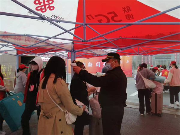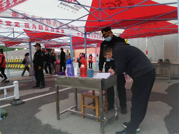 8日?qǐng)?bào)到當(dāng)天,隊(duì)員嚴(yán)防校門疫情防控的第一道關(guān)卡,提醒報(bào)到學(xué)生佩戴口罩,掃學(xué)校健康碼和行程碼,出示48小時(shí)內(nèi)核酸陰性檢測(cè)報(bào)告,并對(duì)學(xué)生隨身物品消毒,按照防疫規(guī)定間隔1米入校,并再次進(jìn)行核酸檢測(cè)。