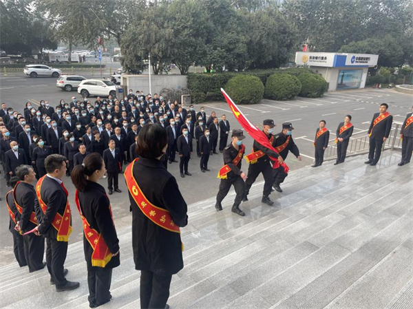 11月1日,建行安陽分行舉行每月首日的升旗儀式。此次升旗儀式邀請?zhí)乇4箨牬箨犻L牛曉波主持,派駐建行門崗特保隊員為旗手,守押隊員協(xié)助