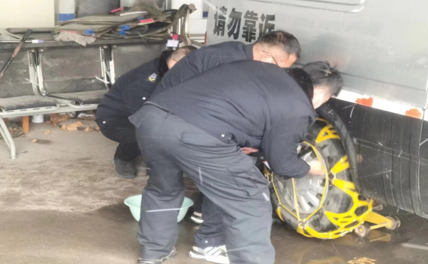 收車后,大隊(duì)長馮文峰帶領(lǐng)各個(gè)車組對押運(yùn)車輛進(jìn)行全面檢查,查看防滑鏈?zhǔn)欠駬p壞、是否可以正常使用。同時(shí),要求各個(gè)車組訓(xùn)練拆裝防滑鏈,以便遭遇大雪、結(jié)冰天氣可以熟練迅速地安裝。
