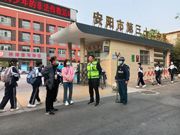 為進一步強化校園安全保衛(wèi)工作,人防分公司以打造平安安陽,守護校園安全,確保校園師生安全為目標,從2023年4月18日開始,人防分公司領(lǐng)導及各大隊中層干部每天早7點至8點半準時到各自分管的校園,疏導交通、維護秩序、保障師生進校安全暢通,協(xié)助校園保安維護學校高峰期安全,為全市區(qū)校園安全保駕護航。
