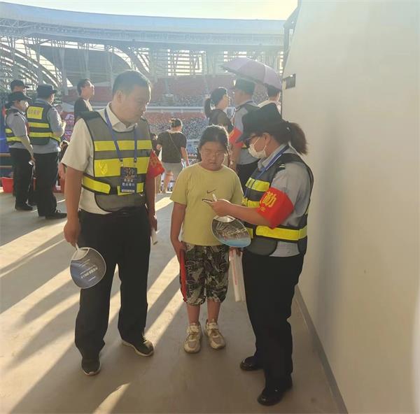 勤務(wù)實施前,大隊成立了大隊長王向煜任組長的安全保衛(wèi)工作領(lǐng)導(dǎo)小組,其他成員依照方案抽調(diào)執(zhí)勤力量,明確任務(wù)分工。勤務(wù)當天下午,各執(zhí)勤單位提前到達預(yù)定位置集結(jié)到位,整理隊伍分發(fā)裝備,按時進入執(zhí)勤崗位。除安排20人編入應(yīng)急機動隊外,其余負責D1和E1區(qū)觀眾席的秩序維護。面對炎炎烈日,大家毫無怨言,依然堅守崗位,對具體崗位任務(wù)落實到具體人員。給群眾提供了力所能及的幫助。下午6點半,李會芳發(fā)現(xiàn)一女孩啼哭不止,便上前詢問。當?shù)弥⑹桥c家長走失時,報告帶隊領(lǐng)導(dǎo)尚斌,并幫她打電話聯(lián)系到家長,使其與家人團聚。