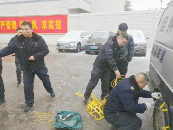 上午收車回來后,楊中朝立即督促各車組人員及時檢查防滑鏈,詢問押運(yùn)途中的工作路況信息,并對車長司機(jī)提出要求,一是要注意特殊路段的道路情況,所有車組至少配齊兩套防滑鏈,避免防滑鏈斷裂,偏遠(yuǎn)線路要攜帶三條防滑鏈;二是要減速慢行,不要強(qiáng)行超車,勻速30-40公里行駛,車長要密切配合司機(jī)觀察路況;三是要用對講機(jī)與大隊(duì)保持聯(lián)系,及時與客戶溝通,取消偏遠(yuǎn)網(wǎng)點(diǎn)的款箱運(yùn)送,調(diào)整下午點(diǎn)名時間,提前出車,不惜一切代價堅(jiān)決打贏這次低溫冰雪天氣攻堅(jiān)戰(zhàn)。
