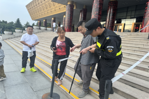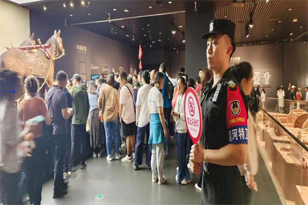 節(jié)日期間,特保大隊實行24小時輪班值守,全體隊員全情投入安保工作。一是嚴(yán)把入口關(guān)。安檢隊員嚴(yán)守各場館入口安檢關(guān)口,細(xì)致排查易燃易爆、管制刀具等違禁物品。僅殷墟博物館、中國文字博物館、漢字公園3處,日均完成超4萬余人次安檢,精準(zhǔn)攔截多起違禁品,筑牢“危險物品不入園”的堅實防線。二是強(qiáng)化內(nèi)部巡邏。館內(nèi)隊員加密巡邏頻次,既重點盯防文物展柜等安全要害,又聚焦客流易聚集區(qū)域。實時疏導(dǎo)擁擠人群,有效防范各類安全風(fēng)險。三是維護(hù)現(xiàn)場秩序。游客熱點區(qū)域,隊員遇人員飽和時,及時引導(dǎo)游客分批次有序游覽,保障良好秩序。四是提供暖心幫助。特保隊員專注引導(dǎo)行人安全通行。遇到老年游客或攜帶重物的游客,主動上前攙扶、協(xié)助搬運行李,以貼心舉措傳遞安保溫度。