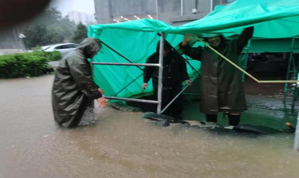 災(zāi)情就是命令,搶險就是責(zé)任。駐安陽分行人防一大隊隊長翟根平同志第一時間啟動應(yīng)急預(yù)案,立即安排帶班隊員輪流值班,在大院門口迅速堆起防汛沙袋建立防汛墻,阻止雨水灌入,對地下車庫里放置的自助設(shè)備、機房庫房、金庫進(jìn)行了重點排查,同時對大院外圍洪澇災(zāi)害情況時刻進(jìn)行監(jiān)控排查。