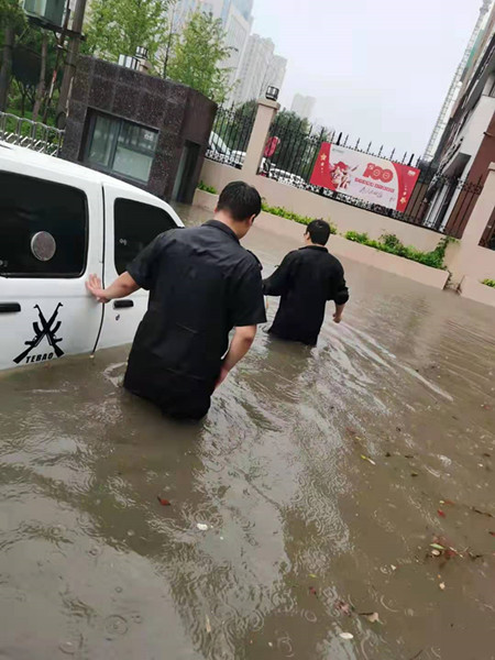 中原銀行受災(zāi)最為嚴(yán)重,洪水從車庫出入口,水流湍急,洶涌下灌,樓梯間水花翻滾,掛起一條條瀑布,看不清臺(tái)階邊緣!值班人員聞?dòng)嶑R上行動(dòng),迅速把押運(yùn)所用槍支、彈藥,車輛停放到安全位置。早上6點(diǎn)地下二層已近灌滿,洪水在地下一層肆虐,金庫重地危險(xiǎn)!雖有八名值班人員率先投入戰(zhàn)斗,但勢(shì)單力薄,難當(dāng)洪水漫灌。7點(diǎn)40分,其余隊(duì)員陸續(xù)到崗,迅速投入戰(zhàn)斗。