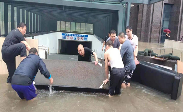 負(fù)一層這時(shí)候水已經(jīng)淹到了膝蓋處;由于配電室被淹導(dǎo)致停電,李艷軍大隊(duì)長(zhǎng)馬上摸黑帶領(lǐng)隊(duì)員裝沙袋,找擋板,蹚著近腰高的深水堵截洪水。背沙袋、拖沙袋、拉沙袋,隊(duì)員們一路小跑,不管用什么辦法,爭(zhēng)分奪秒,搶險(xiǎn)第一,戰(zhàn)勝洪水。