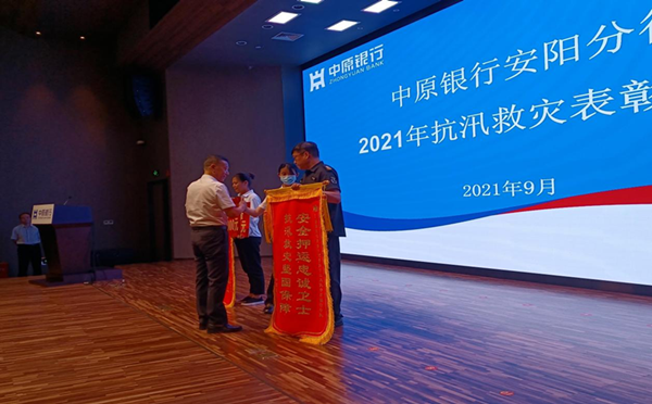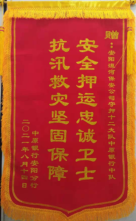 中原銀行安陽分行行長吳擁軍親自為守押十二大隊贈送了錦旗并贈言:押運隊員在這次抗擊災情的戰(zhàn)斗中,面臨險情,不懼危險,身先士卒,敢打敢拼,勇往直前,為這次突如其來的災情作出了突出的貢獻;體現(xiàn)了寶貴的擔當精神,彰顯了洹河押運隊伍訓練有素的過硬作風和鋼鐵意志。