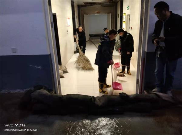 4月6日晚上十一點,人防一大隊駐聯(lián)通公司東區(qū)崗點中、夜班的隊員交接完工作之后,夜班值班隊員杜懷濤、孟慶春開始接班后的正常巡樓工作。當(dāng)他們巡邏到負(fù)二層時,聽到有水流的聲音,職業(yè)的敏感提醒他們,有管道跑水,順著流水的聲音巡去,果不其然,負(fù)二層中央空調(diào)系統(tǒng)供水管道破裂,管道里的水不停向外噴射,如果不及時處置,會引發(fā)負(fù)二層注水,給客戶造成財產(chǎn)損失。兩位值班隊員馬上通知監(jiān)控中心和值班班長,值班班長邱文濤接到報警后迅速向中隊長董紅衛(wèi)匯報情況,同時安排夜班同志到現(xiàn)場處理積水,董紅衛(wèi)趕赴現(xiàn)場后和值班隊員一起配合專業(yè)的維修人員處置險情,經(jīng)過近五個小時的奮戰(zhàn),險情得到妥善解決。