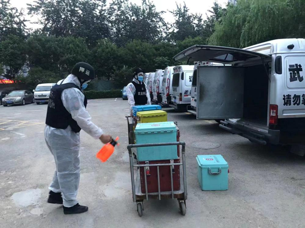 9月8日,因醫(yī)院提供現(xiàn)金支持需從人行取款,段俊杰隊長親自擔(dān)任押運司機,與其余隊員組成兩個車組,共同為范圍遍布大半個安陽市區(qū)的七個網(wǎng)點提供押運勤務(wù)支持。從早晨出車一直忙碌到中午一點,回行簡單吃過工作餐、稍事休息后,又繼續(xù)投入到緊張的押運工作中。勤務(wù)完成后,為確保駐地疫情防控安全,大家對出勤車輛及辦公區(qū)域進行全面消殺,切實把疫情防控工作做嚴密做扎實。
