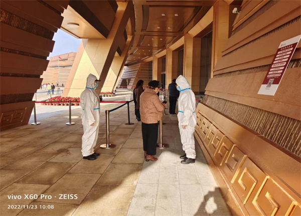中國文字博物館續(xù)建工程開館以來,特保大隊負責館里的安保工作。隨著2022年11月23日疫情防控形勢日益嚴峻,防疫工作更要做到位,期間隊員們都自告奮勇,義無反顧地沖在防疫一線,為參觀的游客筑起防疫的銅墻鐵壁。