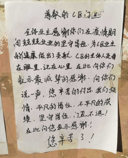 第六天,帕堤歐小區(qū)的一位住戶說(shuō)“平日里,我們對(duì)保安的工作沒有特別在意,這次疫情期間,我看到了保安真是少不了??!”為此,這里的業(yè)主在2月16日下午,聯(lián)名給保安寫了一封感謝信。感謝他們?yōu)闃I(yè)主的健康,為小區(qū)的平安,作出的貢獻(xiàn)。