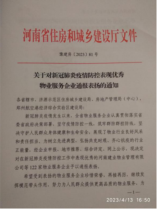 4月8日,河南省住房和城鄉(xiāng)建設廳通報表揚了全省新冠肺炎疫情防控工作表現(xiàn)優(yōu)秀的122家物業(yè)服務企業(yè),安陽鼎誠物業(yè)服務有限公司榜上有名。