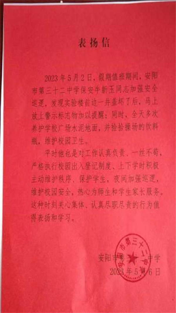 信中說道:5月2日,假期值班期間,牛新玉同志加強安全巡邏,發(fā)現學校實驗樓前邊一井蓋壞了后,馬上放上警示標志加以提醒;同時,全天多次養(yǎng)護學校廣場水泥地面,并撿拾操場的飲料瓶,維護校園衛(wèi)生。平時牛新玉同志對工作認真負責一絲不茍,嚴格執(zhí)行校園出入登記制度、上下學時積極主動維護秩序、保護學生,夜間加強巡邏,維護校園安全,熱心為師生和學生家長服務。這種時刻關心集體、認真履職盡責的行為值得表揚和學習。