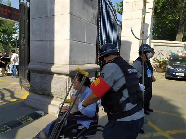 期間,一名開高的考生,因腿受傷不能行走,家長用車子送至一中大門口。保安班長王鳳銀見狀后,主動跟家長和學(xué)校溝通后,帶領(lǐng)隊員接過了護送該考生進入考場的任務(wù)。他們用一中的輪椅,把考生送至考場外,聯(lián)系老師送至考場內(nèi),考試結(jié)束后,再把考生接出送至大門口。
