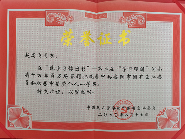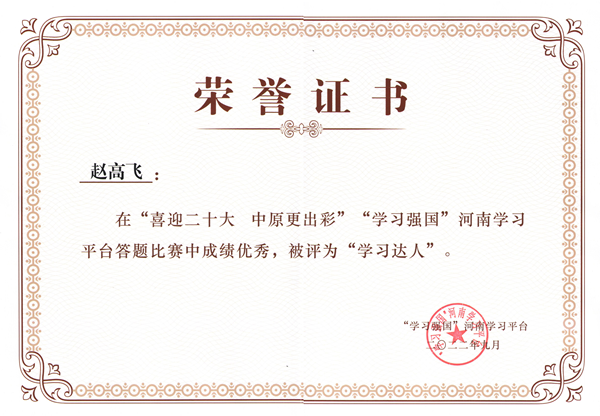 對于平時怎樣學(xué)習(xí),趙高飛有自己的學(xué)習(xí)心得,他認(rèn)為,學(xué)習(xí)要貴在勤奮、貴在鉆研、貴在有恒,每天早上第一件事,就是打開學(xué)習(xí)強(qiáng)國平臺,翻閱感興趣的時事新聞和行業(yè)動態(tài),完成每天的學(xué)習(xí)任務(wù),從不占用工作時間學(xué)習(xí),都是在上班之前就完成了。對于參加比賽如何獲得好的成績,趙高飛有一套自己的學(xué)習(xí)竅門。一是要堅持,每天堅持把當(dāng)日學(xué)習(xí)積分做完,總結(jié)學(xué)習(xí)方法和學(xué)習(xí)技巧。二是勤練習(xí),四人賽、雙人對戰(zhàn)是關(guān)鍵,要勤練習(xí)各個答題模塊,熟能生巧。三是有訣竅,他整理出一整套學(xué)習(xí)題庫達(dá)5000多題,并利用碎片時間翻看熟記于心,他把各種類型的題分類總結(jié),錯題、易錯題收藏起來,反復(fù)練習(xí)、各個擊破,最終,他克服一切困難,集中一切精力用5個小時時間,通關(guān)“強(qiáng)國總題庫”共4202題。四是重交流,他加入了“學(xué)習(xí)強(qiáng)國”全國學(xué)習(xí)聯(lián)盟、“學(xué)習(xí)強(qiáng)國”河南學(xué)習(xí)聯(lián)盟等學(xué)習(xí)微信群,和學(xué)習(xí)達(dá)人們一起探討答題經(jīng)驗(yàn)和技巧
