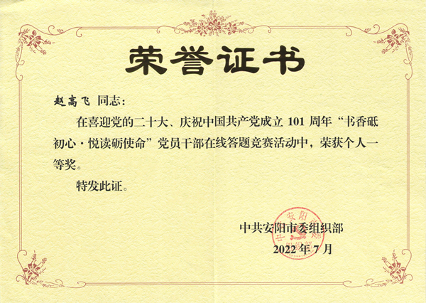 趙高飛,35歲,中共黨員,本科學(xué)歷,現(xiàn)任鼎信子公司副經(jīng)理,自“學(xué)習(xí)強(qiáng)國”平臺上線以來,趙高飛學(xué)習(xí)成績屢創(chuàng)新高,先后榮獲2020年度學(xué)習(xí)強(qiáng)國挑戰(zhàn)賽安陽市賽區(qū)決賽“個人三等獎”,2021年度安陽市黨員干部在線答題競賽“個人三等獎”,2022年度學(xué)習(xí)強(qiáng)國河南學(xué)習(xí)平臺“喜迎二十大、中原更出彩”答題比賽“周達(dá)人”及“學(xué)習(xí)達(dá)人”,2023年度“強(qiáng)國有我 學(xué)習(xí)興安”學(xué)習(xí)強(qiáng)國答題挑戰(zhàn)賽安陽市決賽“個人二等獎”,2023年度學(xué)習(xí)強(qiáng)國河南學(xué)習(xí)平臺“貫徹二十大精神、建設(shè)現(xiàn)代化河南”強(qiáng)國答題比賽“周達(dá)人”。學(xué)習(xí)從來都不是一蹴而就的,這些成績的獲得,是趙高飛日積月累堅持學(xué)習(xí)的成果。