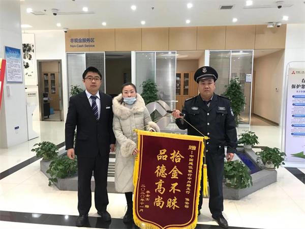 12月2日上午,李女士給中國(guó)建行中州路支行送來一面錦旗,激動(dòng)地對(duì)行長(zhǎng)說?!疤兄x你們了,如果不是建行保安大哥品德高尚,拾金不昧,我的損失就大了。”