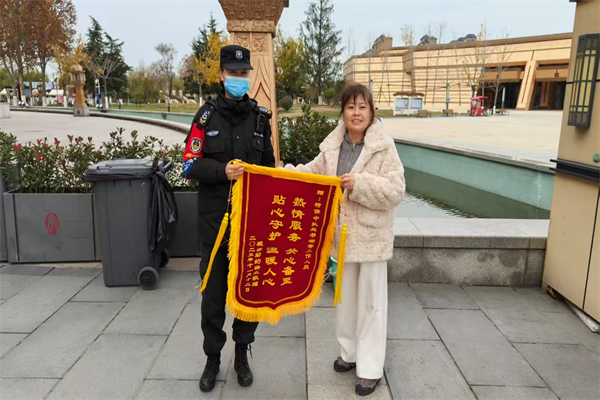 11月17日上午10:20分,中國文字博物館廣場上演暖心一幕:游客劉玉梅手持錦旗專程來到博物館執(zhí)勤點(diǎn),向特保大隊(duì)隊(duì)員趙書娜表達(dá)誠摯謝意。這份特別的感謝,源自5天前一場緊急的“下水道打撈行動”。