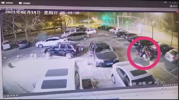 圖為發(fā)現(xiàn)可疑人員,一人圍繞銀行領(lǐng)導(dǎo)車輛查看,一人騎摩托車放風(fēng)(視頻截圖)