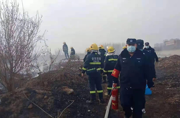 上午9時許,保安員屈國營、郭慶陽、李海軍、申安民巡邏至轄區(qū)中華路王官屯北路時,看到路邊防護林草叢正在燃燒,由于天干物燥,火勢蔓延很快。隊員立即引導旁邊群眾疏散,撥打119消防電話報警,并從車上拿出滅火器冒著滾滾濃煙,全力撲滅大火,盡最大努力防止大火蔓延,避免造成更大的損失。雖然灰燼落滿了全身、汗水濕透了衣背、濃煙模糊了雙眼,但保安員依然斗志昂揚、毫不畏懼。很快,消防救援人員趕到,保安員又配合消防人員,終將燃燒的干草撲滅。
