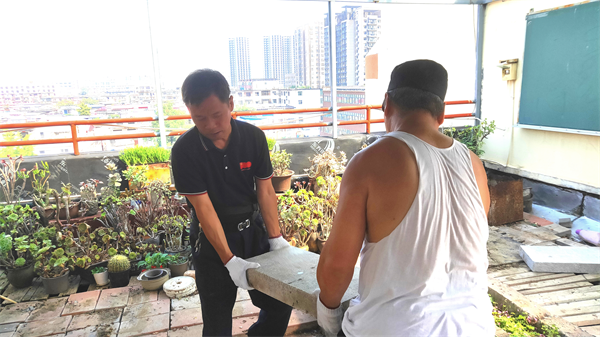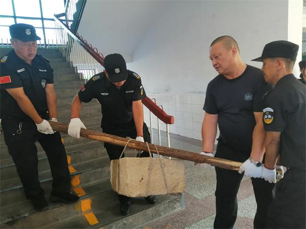 由于該校教學(xué)樓上遺留有一定數(shù)量的花池、石塊、石槽、建筑塊、水泥塊、地板、磚等物,校方排查存在安全隱患,需要把樓頂?shù)臇|西清運(yùn)下來(lái)。按照支部組織謀劃安排,當(dāng)日上午8點(diǎn)半,在黨員、中隊(duì)長(zhǎng)劉宇,預(yù)備黨員、副中隊(duì)長(zhǎng)楊承濤帶領(lǐng)下,同志們齊心協(xié)力、相互配合,采取接力方式向下轉(zhuǎn)運(yùn)。有的一塊石頭有二三百斤,他們就用繩子捆住向下抬,一個(gè)個(gè)累得汗流浹背,但沒(méi)有一個(gè)人叫苦叫累,張運(yùn)洲邊干邊反復(fù)提醒大家注意安全。他們利用一上午時(shí)間,把大部分體積較大的石塊、石板、地磚等物安全清理下樓,又把清運(yùn)堆積在樓道的東西,搬運(yùn)到200米外的樓后隱蔽處。